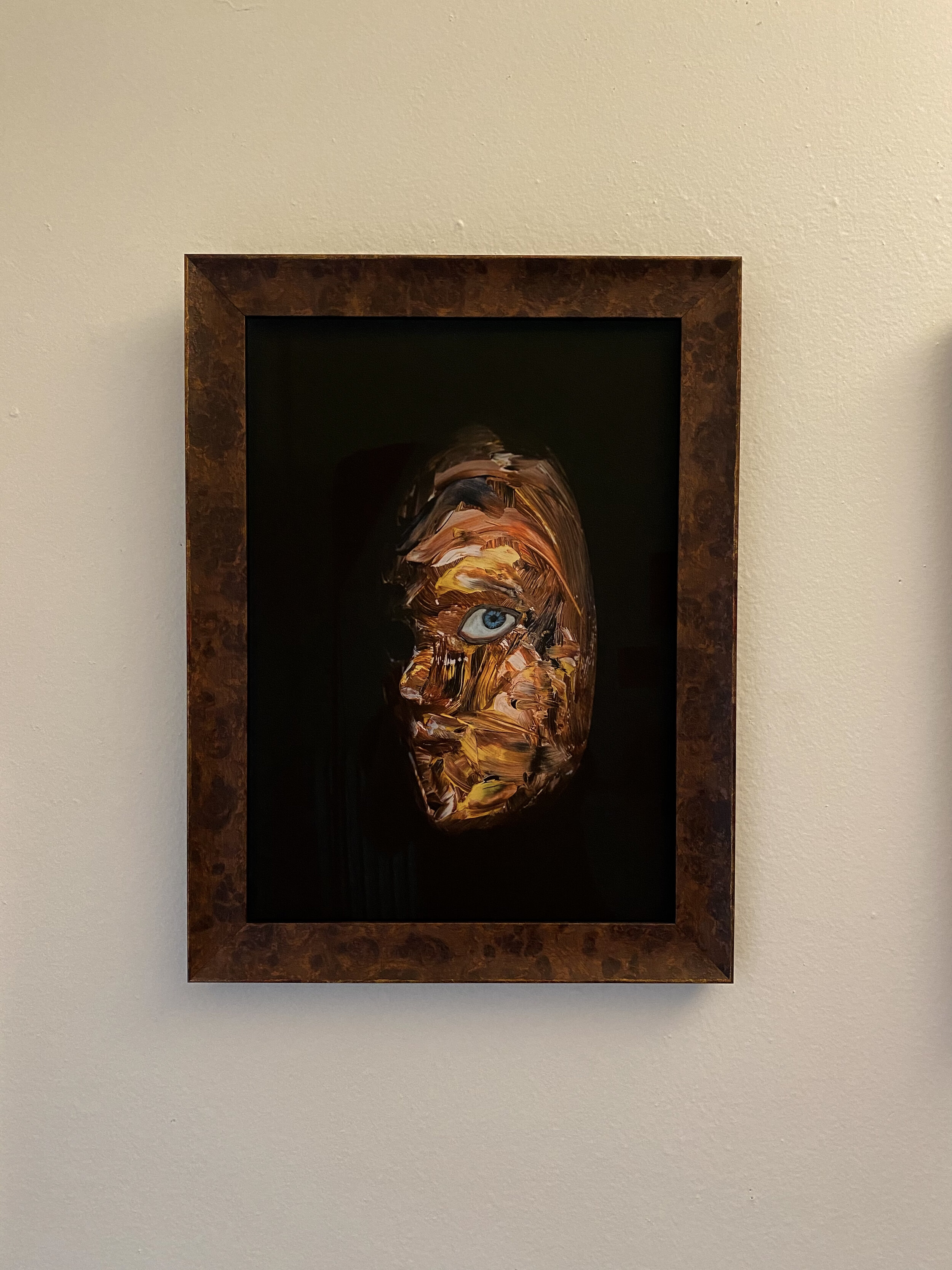 Mixed media. Acrylic on a plastic mask, scanned and printed on fine art paper and then painted with acrylic to add features like the eye. Titled: "Self Portrait on Friday"